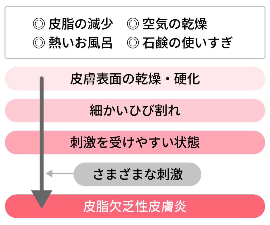 皮膚表面の皮脂(油分)が欠乏し、かゆみをともない、皮膚が乾燥した状態です。